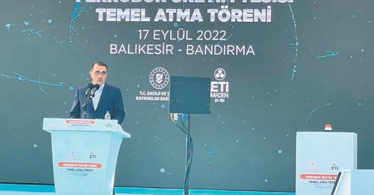 Balıkesir Bandırma'da atıldı. Eti Maden Ferrobor Üretim Tesisi, yılda 800 tonluk ferrobor üretecek. Üretilen ferrobor, başta demirçelik sanayi olmak üzere birçok alanda kullanılacak. Önümüzdeki yıl devreye alınacak tesiste 100 kişilik istihdam sağlanacak. Türkiye'nin nitelikli çelik ihtiyacına ait ve yüzde 100 ithal edilen ferrobor üretimi, cari açığı da düşürecek.