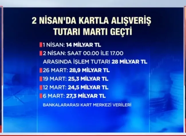 Paylaşılan verilere göre, günlük alışveriş işlem tutarı 2 Nisan'da 28 milyar TL, 1 Nisan'da ise 14 milyar TL olarak gerçekleşti.