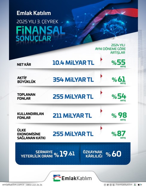Geçtiğimiz yılın aynı dönemine göre %87 artışla ülke ekonomisine 255 Milyar TL kaynak sağlayan Emlak Katılım, aynı dönemde net kârını %55 oranında artırarak 10.4 Milyar TL'ye çıkardı. Aktif büyüklüğünü 354 Milyar TL'ye ulaştıran Emlak Katılım, toplanan fonlarını 255 Milyar TL'ye yükseltti. Aynı dönemde kullandırılan fon büyümesi %98 düzeyinde gerçekleşirken %1.46 seviyesindeki takibe dönüşüm oranı ve %19.61 sermaye yeterliliği oranı ile sektördeki sağlam duruşunu pekiştirdi. Güçlü sermaye yapısı ve etkin risk yönetimiyle desteklenen istikrarlı operasyonel faaliyetleri sayesinde 2025 yılı üçüncü çeyreğinde özkaynak kârlılığını %60 seviyesinde tamamladı.