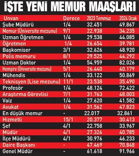 Şube müdürü (1/4) 49 bin 867 lira, memur (üniversite mezunu 9/1) 34 bin 235 lira, uzman öğretmen (1/4) 44 bin 85 lira, öğretmen (1/4) 39 bin 781 lira, başkomiser (3/1) 48 bin 920, polis memuru (8/1) 44 bin 292 lira, uzman doktor (1/4) 82 bin 26 lira, hemşire (üniversite mezunu 5/1) 40 bin 179 lira, mühendis (1/4) 50 bin 869 lira, teknisyen lise mezunu (11/1) 35 bin 490 lira, profesör (1/4) 72 bin 422 lira, araştırma görevlisi (7/1) 48 bin 3 lira, imam hatip (8/1) 34 bin 481 lira, vaiz (1/4) 41 bin 582 lira, avukat (1/4) 47 bin 823 lira alacak. Hizmetli (15/1) 30 bin 413 lira, şef (4/1) 33 bin 967 lira, müdür (4/1) 40 bin 785 lira, ilçe müdürü (4/1) 46 bin 233 lira, daire başkanı 70 bin 848 lira, genel müdür 91 bin 966 lira alacak. Emekli müsteşar (1/1) 53 bin 598 lira, genel müdür (1/1) 47 bin 437 lira, şube müdürü (lisans 1/4) 18 bin 615 lira, memur (4/1) 14 bin 574 lira, öğretmen (1/4) 22 bin 76 lira alacak. En düşük memur emekli aylığı da 14 bin 740 lira oldu.