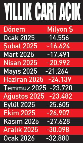 TÜRKİYE Cumhuriyet Merkez Bankası (TCMB) tarafından açıklanan ödemeler dengesi verilerine göre, Ocak 2026'da cari işlemler hesabında 6 milyar 807 milyon dolarlık, altın ve enerji hariç cari işlemler hesabında da 1 milyar 228 milyon dolarlık açık verildi. Türkiye'nin 12 aylık cari açığı Ocak sonu itibarıyla 32.9 milyar dolar ile Aralık 2023'ten bu yana en yüksek seviyeye çıktı. Ödemeler dengesi tanımlı dış ticaret dengesinde de 71.2 milyar dolarlık açık oluştu. Aynı dönemde hizmetler dengesi 63.1 milyar dolar fazla verirken, birincil ve ikincil gelir dengesi sırasıyla 24.1 milyar dolar ve 695 milyon dolar açık verdi. Resmi rezervlerde bu ay 11 milyar 996 milyon dolar net artış oldu.