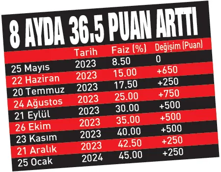 Türkiye Cumhuriyet Merkez Bankası (TCMB) yılın ilk toplantısında politika faizini beklentiler doğrultusunda artırırken, parasal sıkılaşma adımlarının sonlandığına işaret etti. Merkez Bankası Başkanı Hafize Gaye Erkan başkanlığında toplanan Para Politikası Kurulu (PPK) politika faizi olan bir hafta vadeli repo ihale faiz oranını yüzde 42.5'ten 45'e yükseltti. Toplantı sonrası yapılan açıklamada, yurt içi talepteki dengelenmenin, öngörülen dezenflasyon süreci ile tutarlı seyrettiğine işaret ettiği kaydedildi.