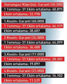 Hem fiyatı hem de garanti geçiş rakamları üzerinden belirli bir kesim tarafından sürekli gündeme getirilen Osmangazi Köprüsü de 1 Temmuz-31 Ekim tarihleri arasındaki verilere göre, devletin verdiği garanti sayısını ortalamada tutturdu. Temmuz-ekim arasında araç geçişi 40 bin 875 oldu.