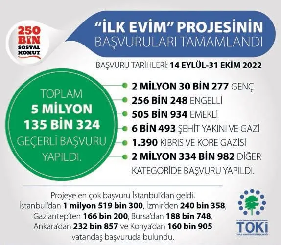 Cumhuriyet tarihinin en büyük sosyal konut kampanyası olarak hayata geçirilen "İlk Evim, İlk İş Yerim" projesine başvuru yapanlar arasında 505 bin 934 emekli, 256 bin 248 engelli vatandaş da yer aldı. Ayrıca 6 bin 493 şehit yakını ve gazi, 1390 Kıbrıs ve Kore gazisinin başvurduğu projeye, 2 milyon 334 bin 982 kategori dışında başvuru oldu.