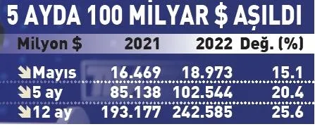 Ticaret Bakanı Mehmet Muş, "242.6 milyar dolara ulaşan 12 aylık ihracatımızla, Sayın Cumhurbaşkanımızın 2022 sonu için işaret ettiği 250 milyar dolar hedefine kararlı adımlarla yaklaşıyoruz" dedi. Türkiye İhracatçılar Meclisi Başkanı İsmail Gülle de, 250 milyar dolara ulaşmak adına ilk 5 ayda ihracatı 10 milyar dolar artt ırmaları gerektiğini belirterek, "250 milyar dolara giden yolda 17 milyar dolar artıdayız. Hedefimize yılı tamamlamadan ulaşacağız" diye konuştu. Mayısta ithalat yüzde 43.8 artarak 29.6 milyar dolar olurken, dış ticaret açığı da yüzde 157 artarak 10.7 milyar dolara çıktı.