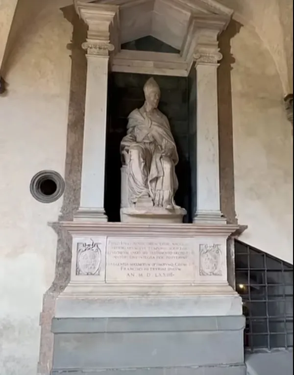 Fotoğraftaki heykel, Floransa'daki Medici Laurentian Kütüphanesi'nin (Biblioteca Medicea Laurenziana) girişinde bulunan Paolo Giovio Anıtı.