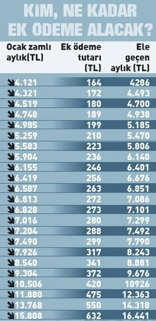 Mevcut aylığı 4016 lira olan emeklinin Ocak'ta zamlı aylığı 5259 lira, 210 liralık ek ödeme ile birlikte eline geçecek toplam aylık 5470 liraya çıkacak. Emekli aylığı 4321 lira olan 172 lira, 4748 lira olan 189 lira, 5583 lira olan 223 lira, 6155 lira olan 246 lira ek ödeme alacak.