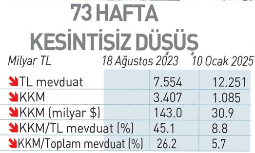 Ağustos 2023'te 143 milyar dolar olan KKM'nin büyüklüğü, geçen hafta 31 milyar dolara geriledi. KKM'de bu süreçte yaşanan düşüş 112 milyar dolar oldu. 3.4 trilyon lira ile tarihi zirveyi gördüğü 18 Ağustos 2023'ten bu yana 73 haftadır kesintisiz düşerek 10 Ocak 2025 itibarıyla 1 trilyon 85 milyara gerileyen KKM'nin toplam mevduat içerisindeki payı da yüzde 26.2'den 5.7'e indi. KKM'nin TL mevduat içerisindeki payı ise yüzde 45.1'den 8.8'e geriledi. KKM hariç standart TL mevduatın payı ise yüzde 31.9'den 59.3'e yükseldi. Döviz hesaplarının payı ise yüzde 34.9'a indi.