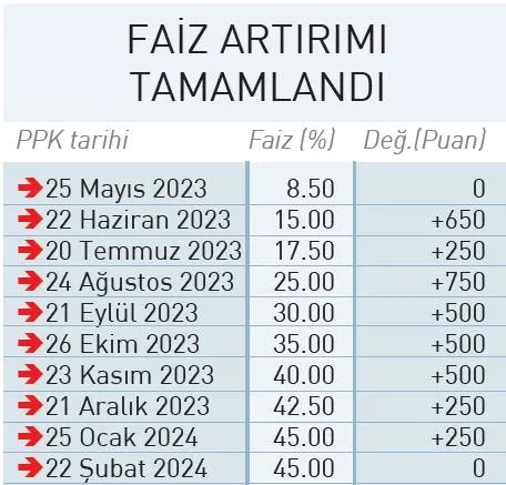 3 Şubat'ta başkanlığa atanan Fatih Karahan başkanlığında toplanan Para Politikası Kurulu politika faizi olan bir hafta vadeli repo ihale faiz oranının yüzde 45 düzeyinde sabit tutulmasına karar verdi. Para Politikası Kurulu gerçekleştirdiği son 8 toplantının tamamında faiz artırım kararı almıştı. Bu toplantılarda faiz toplam 36.5 puan artırılarak yüzde 8.5'ten 45'e çıkarıldı.