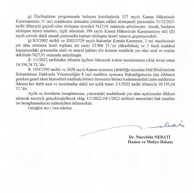 Diğer taraftan, Sayın Cumhurbaşkanımız tarafından kamu görevlilerinin mali ve sosyal haklarında 1/1/2022 tarihinden geçerli olmak üzere yüzde 2,5 oranında ilave artış yapılacağı açıklanmıştır. Söz konusu artışa ilişkin Kanun Teklifinin görüşmelerine Türkiye Büyük Millet Meclisinde başlanacak olup, Teklifin Türkiye Büyük Millet Meclisince kabul edilmesi halinde Resmi Gazetede yayımlanmasını müteakip 1/1/2022-30/6/2022 döneminde geçerli olmak üzere uygulanacak katsayılar, sözleşme ücreti artış oranları ve ücret tavanları ile ortalama ücret toplamı üst sınırı söz konusu artışı da yansıtacak şekilde Bakanlığımızca yeniden belirlenerek duyurulacaktır.