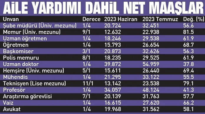 Hazine ve Maliye Bakanlığı tarafından yapılan açıklamada , "Cumhurbaşkanı Recep Tayyip Erdoğan tarafından en düşük memur maaşının 22 bin liraya yükseleceği açıklanmıştı. Aile yardımı alan memur dikkate alınarak en düşük memur maaşı yüzde 86 zamla 10 bin 169 lira artmış oldu. Bu kapsamda, kamu görevlilerinin maaşlarında net 8 bin 77 lira artış yapılmasına ilişkin yasa teklifinin görüşmelerine Meclis'te başlanacak. Bu düzenlemenin yasalaşması halinde aile yardımı ödeneği dahil en düşük memur maaşı 11bin 848 liradan 22 bin 017 liraya yükselecek olup en düşük memur emekli aylığı ise 7 bin 901 liradan 9 bin 288 liraya çıktı" denildi. Temmuz dönemi itibariyle kamu çalışanlarının aile yardımı dâhil net maaşları şöyle oldu: Üniversite mezunu (4/1) şube müdürünün 20 bin 724 lira olan maaşı 32 bin 451 liraya, üniversite mezunu memurun (9/1) 12 bin 632 lira olan maaşı 22 bin 938 liraya çıktı. Uzman öğretmenin (1/4) 18 bin 246 lira olan maaşı 29 bin 538 liraya yükseldi. Öğretmenin (1/4) 15 bin 793 lira olan maaşı 26 bin 654 liraya, başkomiserin (3/1) 20 bin 873 lira olan maaşı 32 bin 626 liraya, polis memurunun (8/1) 18 bin 235 lira olan maaşı 29 bin 525 liraya, uzman doktorun (1/4) 39 bin 872 lira olan maaşı 54 bin 959 liraya, üniversite mezunu hemşirenin (5/1) maaşı 15 bin 611 liradan 26 bin 440 liraya, mühendisin (1/4) 21 bin 295 liradan 33 bin 122 liraya, lise mezunu teknisyenin (11/1) 13 bin 142 lira olan maaşı 23 bin 538 liraya yükseldi.