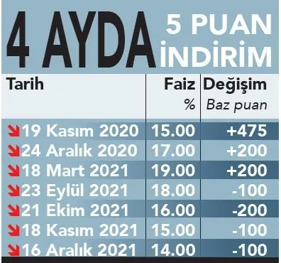 Geçtiğimiz üç ay 4 puanlık faiz indirimi gerçekleştiren Merkez Bankası Para Politikası Kurulu, bu yılın son toplantısında da faizi düşürürken, önümüzdeki yılın ilk çeyrek sonuna kadar indirimlere ara verme sinyalini verdi. Merkez Bankası Başkanı Şahap Kavcıoğlu başkanlığında toplanan PPK, politika faizi olan bir hafta vadeli repo ihale faiz oranını 100 baz puan indirerek yüzde 14'e çekti. Merkez Bankası böylece son 4 ayda faizi 5 puan indirmiş oldu.