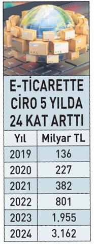 Ticaret Bakanı Ömer Bolat, 2024 itibarıyla Türkiye'de e-ticaret hacminin bir önceki yıla göre rekor bir yükselişle yüzde 61.7 oranında artarak 3 trilyon 162 milyon liraya ulaştığını kaydetti. Buna göre e-ticarette ciro 2024'te günde ortalama 8 milyar 663 milyon lira, saat başı 360 milyon 958 bin TL, dakikada 6 milyon 15 bin TL, saniye ise 100 bin 266 lira olarak gerçekleşti.
