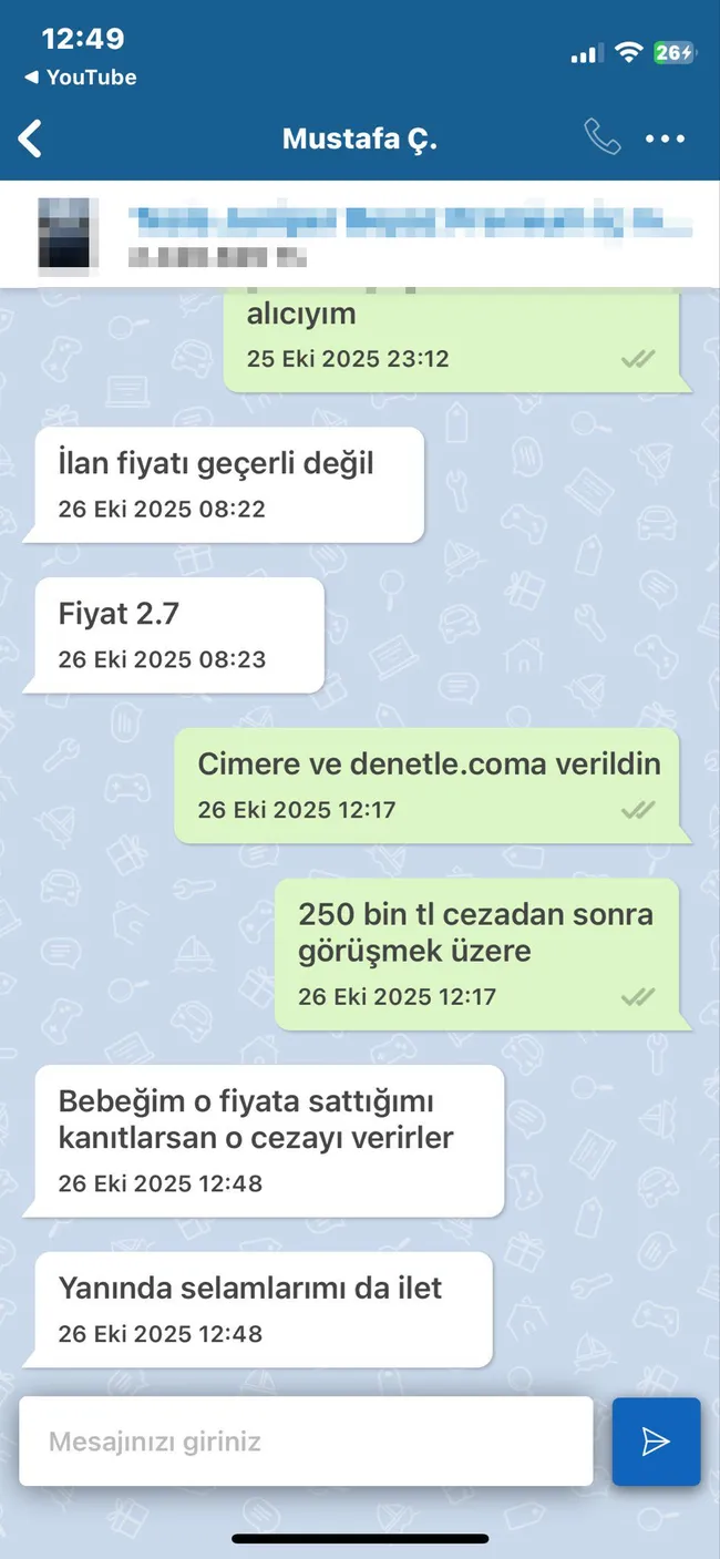 Alıcı ise satıcı Mustaf Ç'yi şikayet ettiğini ve ceza alacağını söyledi. Ancak bu mesajı ciddiye almayan satıcı "Bebeğim o fiyata sattığımı kanıtlarsan o cezayı verirler. Yanında selamlarımı da ilet" dedi.