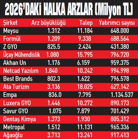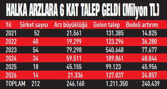 Borsada 2021'den bu yana hızlanan halka arzlar, 2026'da da piyasanın sürükleyicisi olmaya devam ediyor. Borsa İstanbul'da 2026'da 14 şirket halka arz gerçekleştirdi. Bu halka arzların büyüklüğü 21 milyar 336 milyon TL olurken, 127 milyar lirayı aşkın talep geldi. Borsa İstanbul'da yılın çeyreğinde bedelli sermaye artırımları ile sağlanan kaynak ise 24.8 milyar lira oldu. Böylece bu yıl şimdiye kadar şirketlere sağlanan toplam kaynak 46.2 milyar TL oldu.