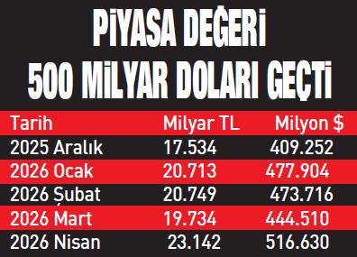 BORSADA 2025 sonunda 17.5 trilyon lira (409.2 milyar $) olan şirketlerin piyasa değeri şubat sonunda 20.7 trilyon liraya (473.7 milyar $) çıkmıştı. Körfez'deki savaşın etkisiyle şirketlerin değeri mart sonunda 19.7 trilyon liraya (444.5 milyar $) indi. Piyasa değeri 20 Nisan itibarıyla 23.1 trilyon liraya (516.6 milyar dolar) çıktı. Böylece piyasa değeri mart sonundan bu yana 3.4 trilyon lira yükselmiş oldu.