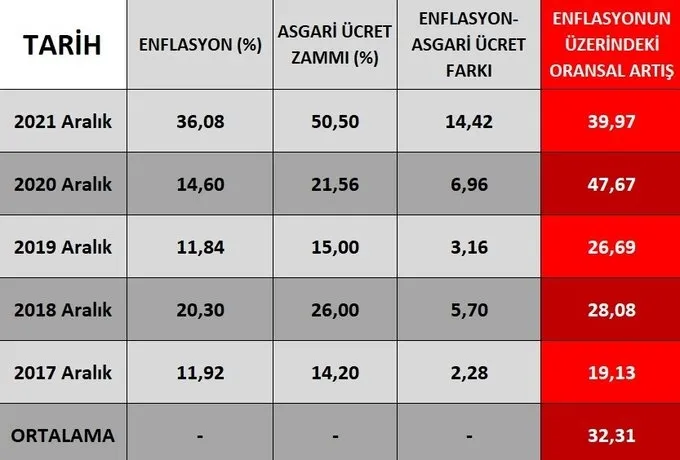 Tabloda görüldüğü üzere; Asgari ücrete yapılan zam oranları ile son 5 yılın enflasyon oranlarını beraber değerlendirdik. Buna göre asgari ücret her yıl enflasyonun üzerinde gerçekleşti. Tabloda kırmızı ile görülen oranlar asgari ücretin oransal olarak enflasyonun yüzde kaç üzerinde olduğunu yansıtıyor. Bunun ortalaması da yüzde 32,31 oldu. Yani son 5 yılda asgari ücret ortalama olarak 32,31 enflasyonun üzerinde oldu.