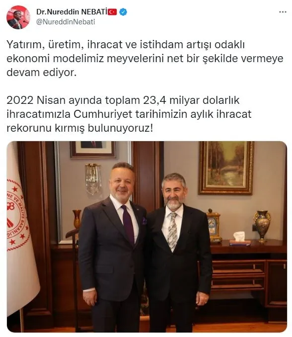 Nebati, Twitter hesabından yaptığı paylaşımda, yatırım, üretim, ihracat ve istihdam artışı odaklı ekonomi modelinin meyvelerini net bir şekilde vermeye devam ettiğini, 2022 Nisan ayında toplam 23,4 milyar dolarlık ihracatla Cumhuriyet tarihinin aylık ihracat rekorunun kırıldığını belirtti.