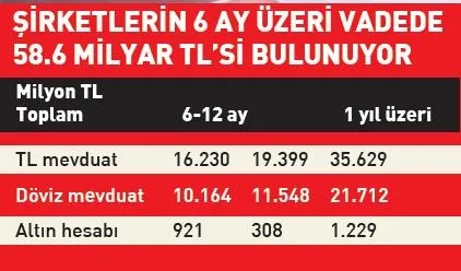 Bankacılık Düzenleme ve Denetleme Kurumu'nun kasım ayı verilerine göre tüzel kişilerin 6-12 vadeli TL mevduatı 16.2 milyar TL, 1 yıl üstü TL mevduatı ise 19.4 milyar lira seviyesinde bulunuyor. Şirketlerin 6 ayın üstünde vadeye sahip 35.6 milyar liralık TL, 21.7 milyar liralık döviz, 1.2 milyar liralık da altın hesabı bulunuyor. Hesapların toplam büyüklüğü ise 58.6 milyar liraya ulaşıyor.