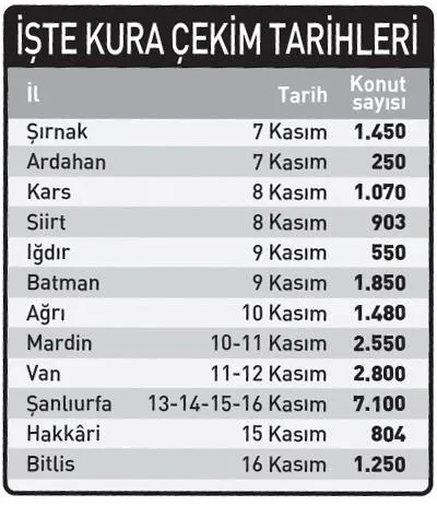 Cumhuriyet tarihinin en büyük sosyal konut hamlesinin ilk etabında yer alan 250 bin konutun başvuruları 31 Ekim'de tamamlanırken, kura çekim süreci de bugün başlıyor. Vatandaşın yoğun ilgi gösterdiği konutlara alınan 8 milyon başvurunun 5 milyon 135 bin 324'ü geçerli sayıldı. İlk kurular bugün Şırnak ve Ardahan'daki toplam 1.700 konut için çekilecek. Çevre, Şehircilik ve İklim Değişikliği Bakanı Murat Kurum, bugün başlayarak, 12 ilde 22 bin 57 konutun kurasını 10 günde tamamlayacaklarını bildirdi.