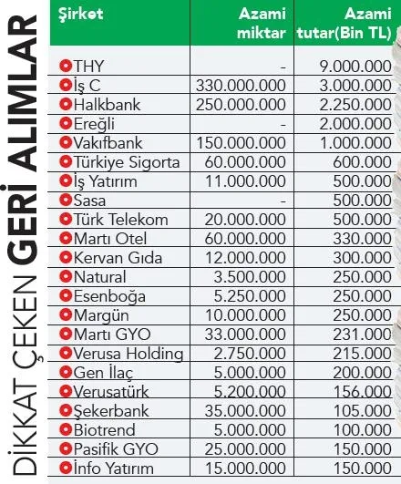 Hisse geri alım kararı alan şirketler, piyasanın moralinin yükselmesinde etkili oldu. Ereğli 2 milyar, THY 9 milyar TL, İş Bankası 3 milyar TL, Türk Telekom 500 milyon TL, Sasa 500 milyon TL'lik geri alım yapacağını açıkladı. Halkbank daha önce 750 milyon TL olarak belirlediği tutarı 2 milyar 250 milyon liraya, Vakıfbank 500 milyon liradan 1