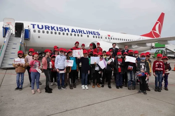 THY'nin İstanbul'dan Ordu- Giresun Havalimanı'na iniş yapan ve bugün için sefer sayısı TK1920 olarak belirlenen uçağa kendi isimlerine düzenlenmiş biniş kartları ile binen çocuklar, pilotlar ve kabin memurlarıyla tanışarak derste çizdikleri havacılık temalı resimleri uçuş ekiplerine hediye ettiler.