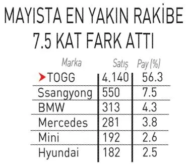 Togg, geçen ay 4 bin 140 adetlik satışla en yakın rakibine 3 bin 590 adet fark attı. Bu dönemde Togg'un elektrikli otomobil pazar payı yüzde 56.33 olarak kayıtlara geçti. Bir diğer ifadeyle satılan her 2 elektrikli otomobilden 1'i Togg T10X oldu.
