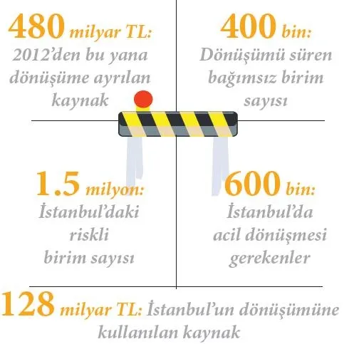 İstanbul'da ise 600 bini acil, dönüştürülmesi gereken 1.5 milyon konut bulunuyor. Olası deprem riskine karşı dönüşümü hareketlendirmek için çalışmalar devam ediyor. Riskli yapıların hızla yenilenmesi için önemli teşvikler veriliyor. Kamu tarafında binlerce konutluk birçok proje yürütülürken, vatandaş da çeşitli desteklerle kendi evini kendisi dönüştürebiliyor. Evini dönüştürmek isteyen vatandaşa hükümet her türlü desteği sağlıyor.