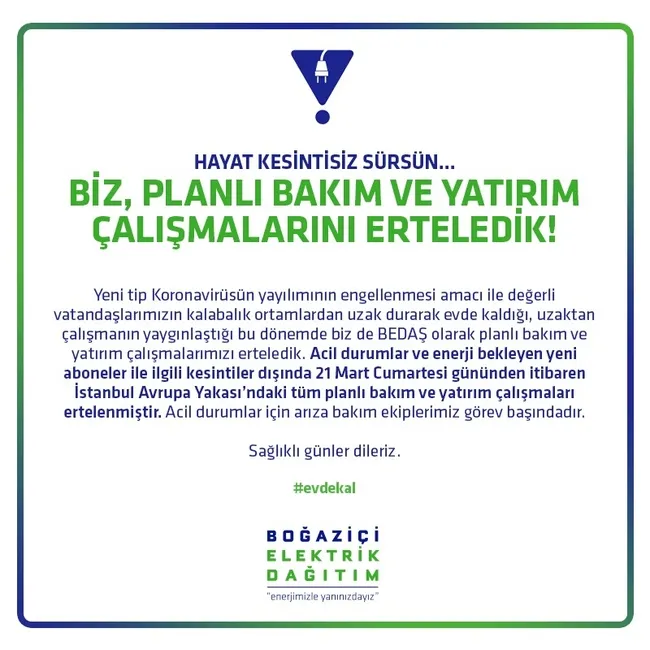 Açıklamada, Kovid-19 yayılımının engellenmesi amacıyla vatadandaşların evde kalması ve uzaktan çalışmanın yaygınlaşması sebebiyle planlı bakım ve yatırım çalışmalarının ertelendiği ifade edilerek, "Acil durumlar ve enerji bekleyen yeni aboneler ile ilgili kesintiler dışında 21 Mart Cumartesi gününden itibaren İstanbul Avrupa Yakası'ndaki tüm planlı bakım ve yatırım çalışmaları ertelenmiştir." denildi.