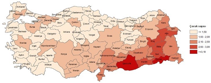 Toplam doğurganlık hızının en yüksek olduğu il 2020 yılında 3,71 çocuk ile Şanlıurfa oldu. Bu ili 3,22 çocuk ile Şırnak, 2,88 çocuk ile Ağrı ve Siirt izledi. Toplam doğurganlık hızının en düşük olduğu il ise 1,29 çocuk ile Karabük oldu. Bu ili 1,31 çocuk ile Zonguldak ve Kütahya izledi.
