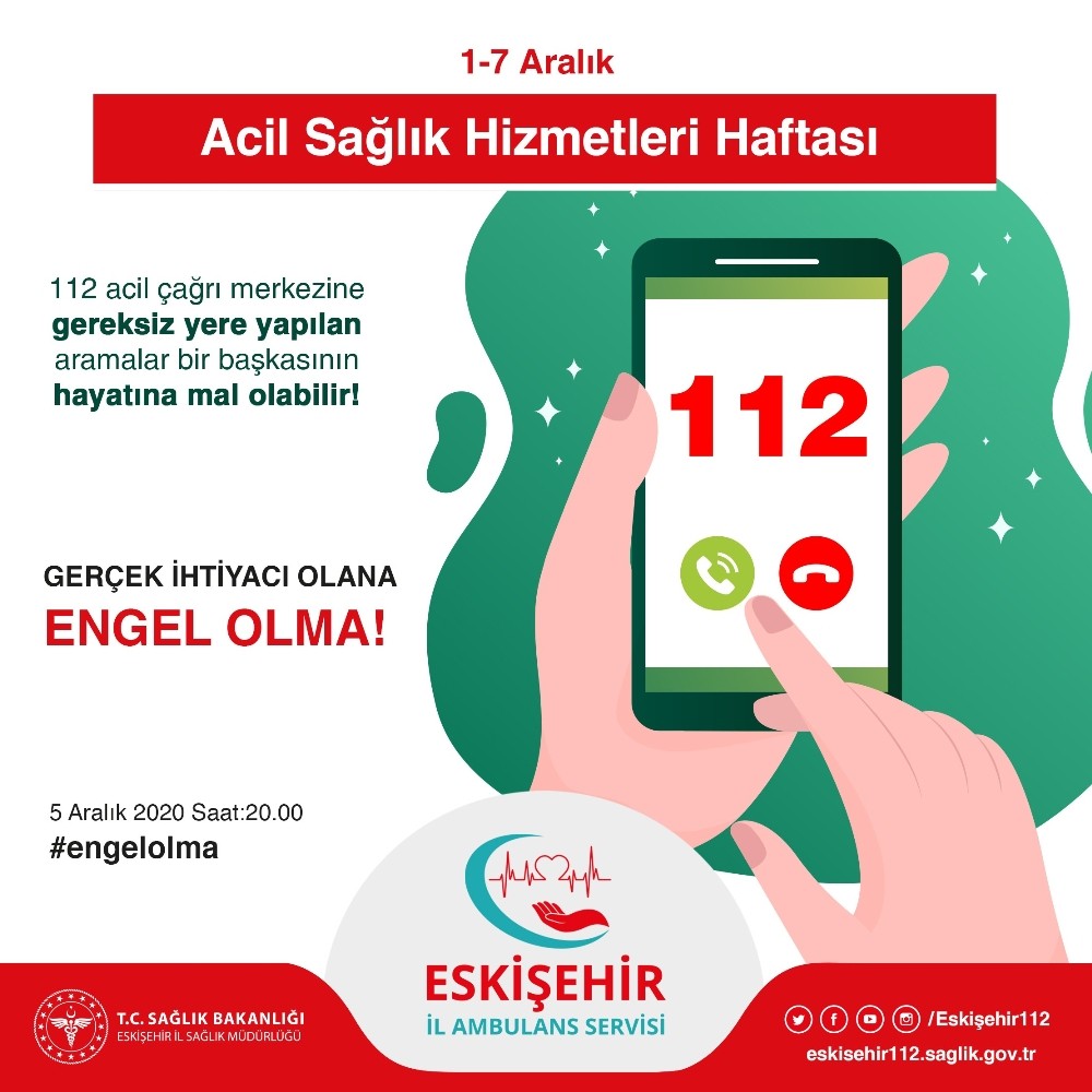 Acil sağlık hizmetlerinin gereksiz ve amacı dışında kullanımının önüne geçmek ve farkındalık oluşturmak amacıyla 1-7 Aralık Acil Sağlık Hizmetleri Haftası’nda Eskişehir İl Ambulans Servisi Başhekimliği tarafından sosyal üzerinden “#engelolma” etiketiyle bir kampanya başlatıldı. Kampanya, acil durumlarda sağlık hizmeti alınması için kullanılan 112 acil çağrı hattına gelen gereksiz çağrıların neden olduğu aksaklıkları öne çıkarmaya çalışıyor. Eskişehir İl Ambulans Servisi Başhekimliği tarafından 1-7 Aralık Acil Sağlık Hizmetleri Haftası kapsamında çeşitli etkinliklerle yaşanan sıkıntılara ve zorluklara dikkat çekiliyor. Bu doğrultuda Eskişehir’de ve Türkiye genelinde #engelolma etiketiyle bir Twitter kampanyası başlatılarak sağlık çalışanlarının sesinin duyurulması amaçlanıyor. 5 Aralık günü saat 20.00’de başlayacak etkinliğe büyük bir katılım gösterilmesi bekleniyor.