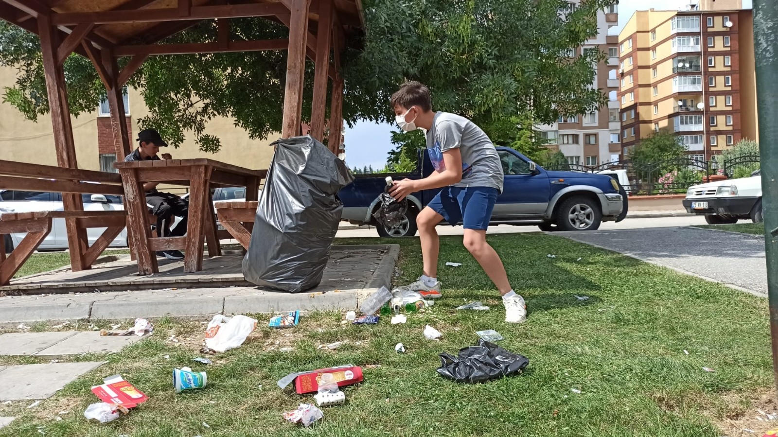 Eskişehir’de zaman geçirmek için parka gelen 13 yaşındaki Eymen Çiçek, parkı kirli görünce çöpleri topladı.