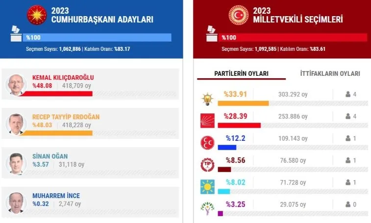 Kılıçdaroğlu yüzde 48.08, Recep Tayyip Erdoğan yüzde 48.03, Sinan Oğan yüzde 3.57 ve adaylıktan çekildiğini açıklayan Muharrem İnce yüzde 0.32 oranında oyun sahibi oldu.