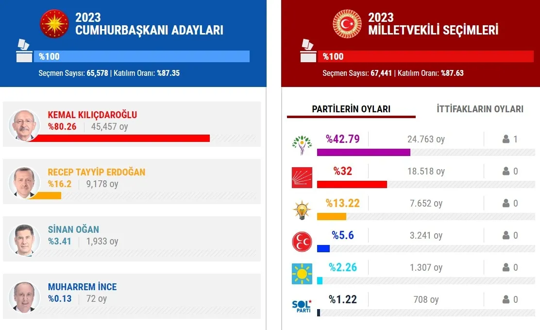Tunceli ikinci tur seçim sonuçları 28 Mayıs sandığa giden seçmen tarafından merak ediliyor. Canlı açılan sandık oranları ve oy sonuçları YSK üzerinden anbean kamuoyu ile paylaşılıyor. Cumhurbaşkanı seçimi için sabah 08.00 itibariyle sandığa giden seçmen kendisini temsil etmesini istediği aday için ayrılan bölüme EVET mührünü bastı, şimdi ekran başında seçim sonuçlarının açıklanmasını bekliyor. Peki, Tunceli ikinci tur seçim sonuçları açıklandı mı? İkinci turda Recep Tayyip Erdoğan, Kemal Kılıçdaroğlu arasından seçimi kim kazandı? İşte, Tunceli oy sonuçları 2023...