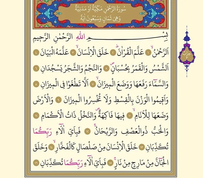 Rahman Suresi Mekke döneminde nazil olan surelerdendir. 78 ayetten oluşur. Bu surede genel olarak insanların hem kendilerinde hem de kendilerinin dışındaki dünyada görebilecekleri birçok farklı nimete değinilmiştir. Bunların sorumluluklarının bilincinde olmanın kulluk açısından önemine değinen bir suredir. Aynı zamanda insanlara ve cinlere müşterek bir şekilde seslenen cehennemin ve cennetin tasvirine yer veren surelerdendir.