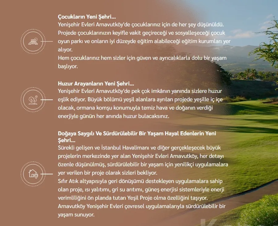 Arnavutköy'de İstanbul Havalimanı'na yakın konumda, hayata geçirilecek. Yenişehir Evleri Arnavutköy, sakinlerinin tüm ihtiyaçlarını bünyesinde barındıracak büyük bir şehir vizyonuyla hayata geçiyor.