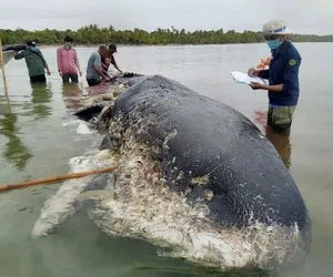 Çevre ve Orman Bakanlığından yapılan açıklamada, Wakatobi bölgesindeki Kapota Adası'nda, kıyıya vurmuş halde cesedi çürümeye başlayan 9,5 metre uzunluğunda İspermeçet balinası bulunduğu bildirildi.