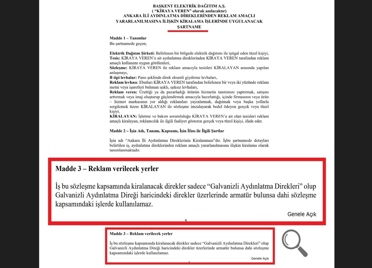 Ankara Büyükşehir Belediyesi ve Başkent Elektrik Dağıtım A.Ş. tarafından Başkent'teki aydınlatma direklerinin reklam amaçlı kullanımına ilişkin kiralama işlemlerinde 1 milyar TL'lik yolsuzluğunun sözleşmeleri ortaya çıktı.