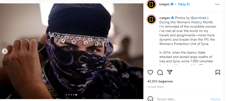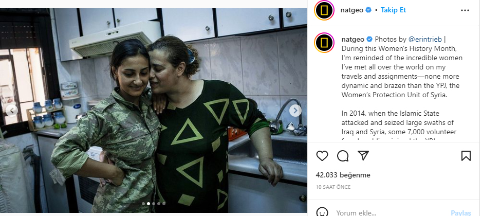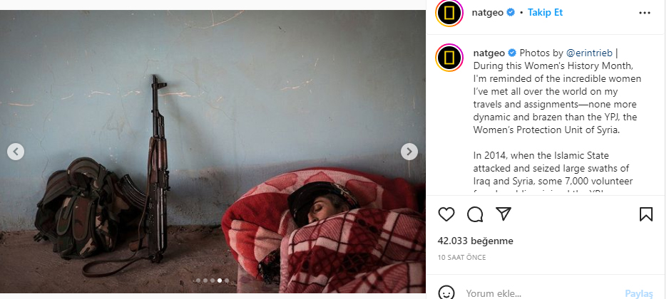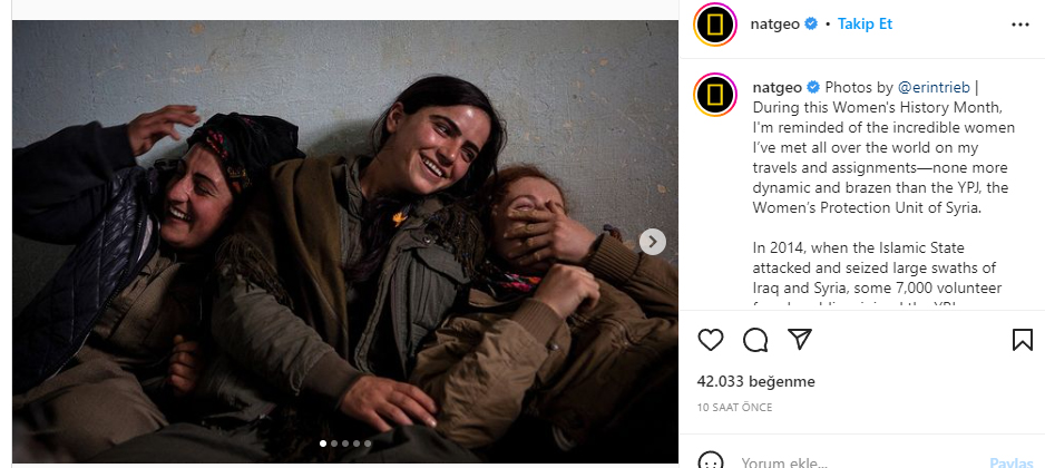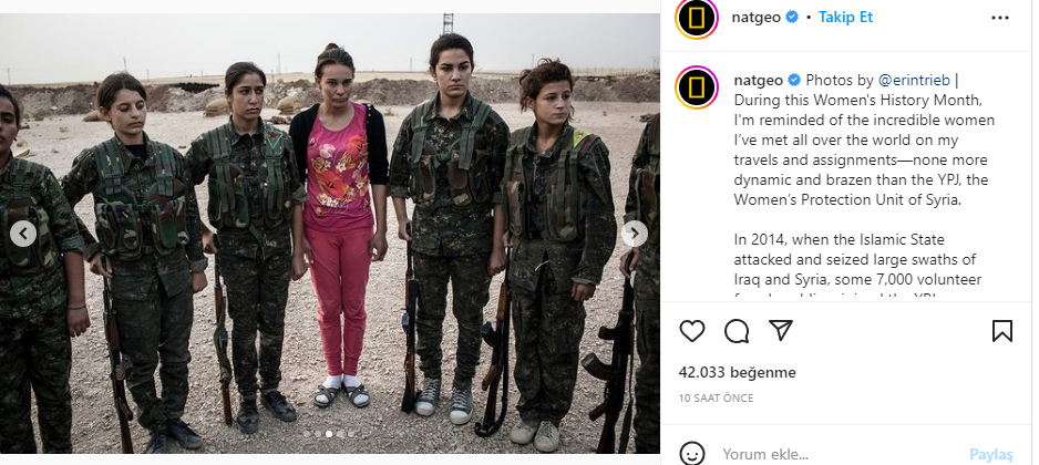 ABD merkezli belgesel kanalı National Geographic'in sosyal medya hesabından yapılan bu skandal paylaşım tepkilere neden oldu. Açık açık PKK propagandası yapan hesap, PKK'lı kadın teröristleri fotoğraflayan ve İstanbul'da yaşayan fotoğrafçı Erin Trieb'in terör örgütü içinde çektiği fotoğraflarına yer verdi.