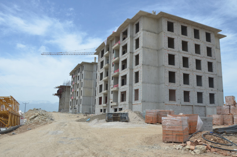 Depremlerden en fazla etkilenen yerleşim birimleri arasında yer alan Kahramanmaraş'ın Afşin ilçesinde Toplu Konut İdaresince (TOKİ) yapılan kalıcı konutların inşası devam ediyor.