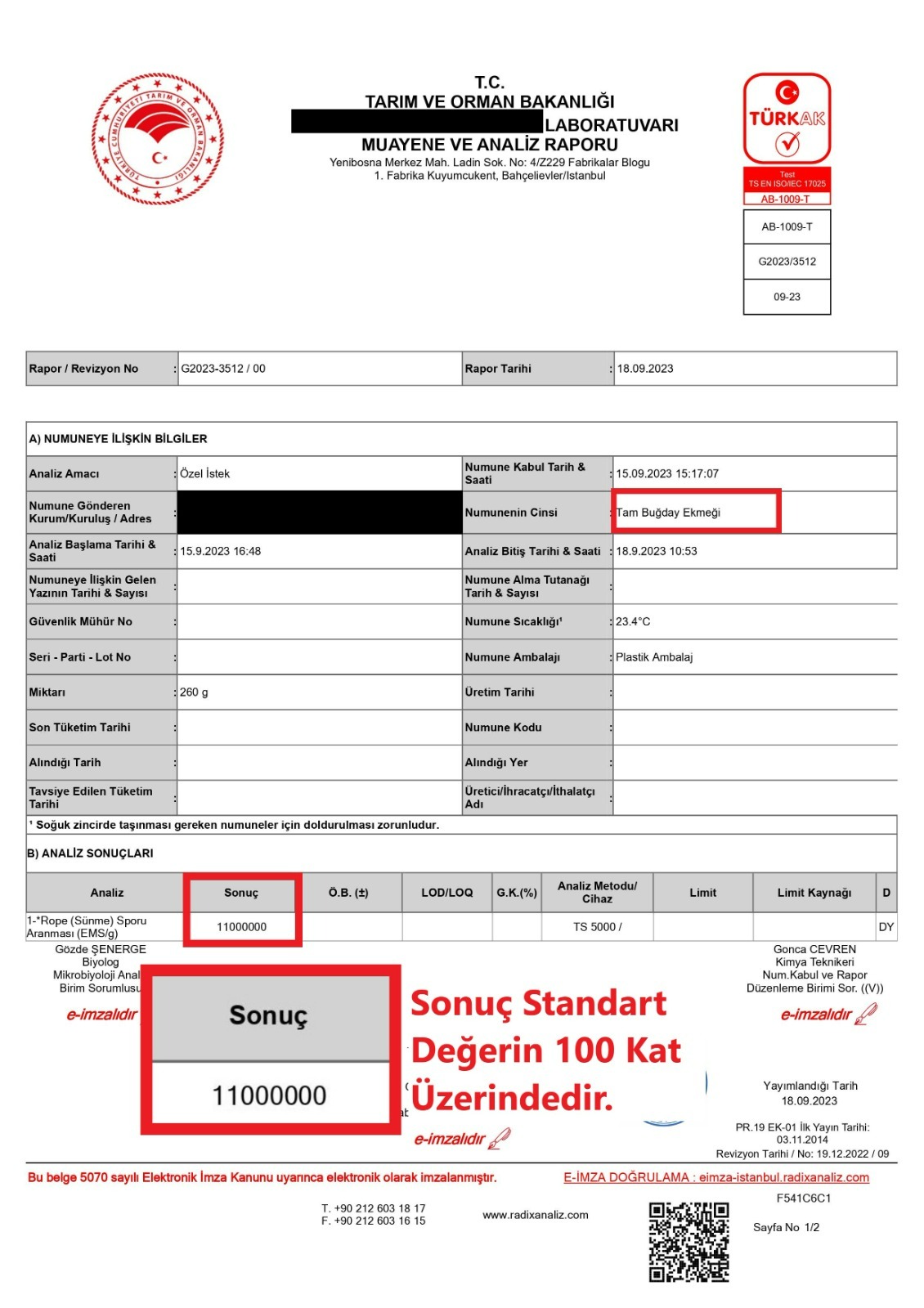 Mikrobiyoloji Ana Bilim Dalı Birim Sorumlusu Biyolog Gözde Şenerge ve Numune Kabul ve Rapor Düzenleme Birimi Sorumlusu Kimya Teknikeri Gonca Cevren e-imzalı G2023-3512/00 no'lu raporda analizi yapılan tam buğday ekmeğinde 11 milyon Rope Sünme Sporu (EMS/g) belirlendi.