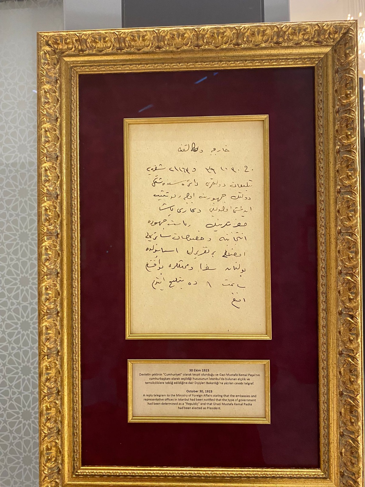 Sergide 30 Ekim 1923'te devletin şeklinin Cumhuyet olarak tespit olunduğu ve Gazi Mustafa Kemal Paşa'nın cumhurbaşkanı olarak seçildiğini anlatan belge de yerini aldı. Cumhuriyetin ilan günü olan 29 Ekim'de bütün yurtta yüz pare top atışı yapılmasına dair yayımlanan telgraf da sergilendi.