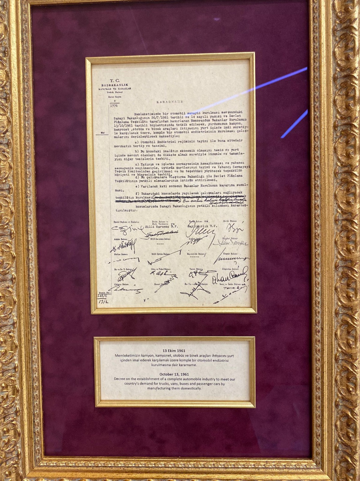 Memleketin kamyon, kamyonet, otobüs ve binek araç ihtiyacını yurt içinden imal ederek karşılanmak üzere komple bir otomobil endüstrisi kurulmasına dair kararnameden,beş yıllık sanayi planlarına göre kurulmuş ve kurulacak sanayi tesislerine ait ayrıntı listeye kadar tarihi belgeler sunuldu.