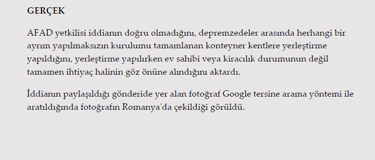 AFAD yetkilisi iddianın doğru olmadığını, depremzedeler arasında herhangi bir ayrım yapılmaksızın kurulumu tamamlanan konteyner kentlere yerleştirme yapıldığını, yerleştirme yapılırken ev sahibi veya kiracılık durumunun değil tamamen ihtiyaç halinin göz önüne alındığını aktardı. İddianın paylaşıldığı gönderide yer alan fotoğraf Google tersine arama yöntemi ile aratıldığında fotoğrafın Romanya'da çekildiği görüldü.