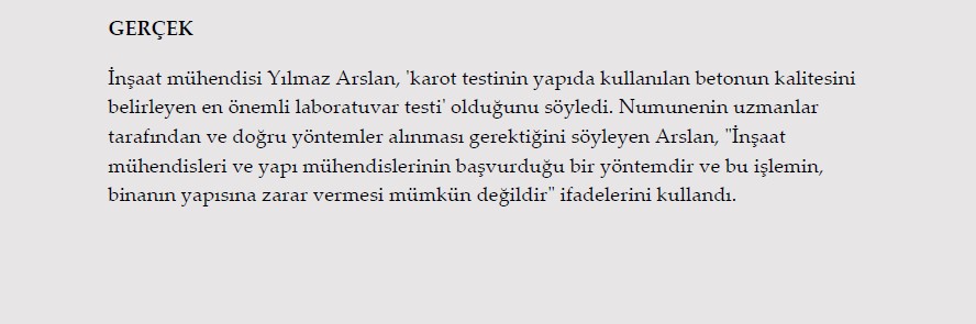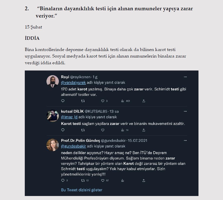 2. "Binaların dayanıklılık testi için alınan numuneler yapıya zarar veriyor." 15 Şubat İDDİA