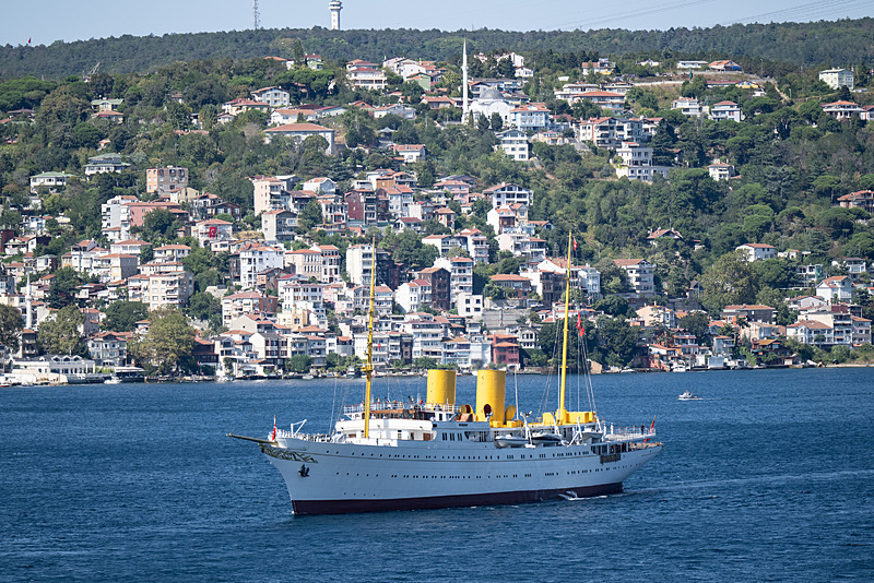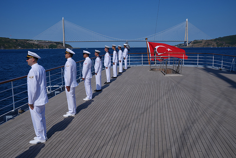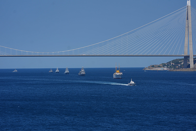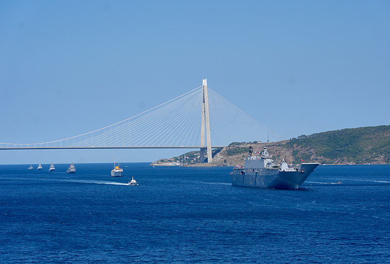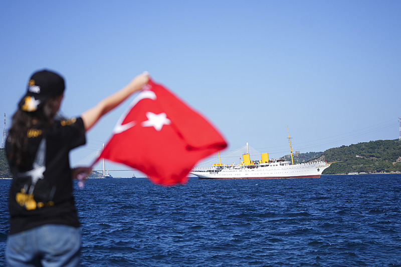 TCG ANADOLU, 'Mavi Vatan Boğaz Geçişi' için Gençlik ve Spor Bakanlığı ile T3 Vakfı tarafından belirlenen 250 öğrencinin katılımıyla Sarayburnu'ndan sabah saatlerinde demir aldı. TCG Anadolu, aralarında TCG Savarona, Deniz Kuvvetlerine ait gemiler, TCG Hızır Reis Denizaltısı'nın da bulunduğu 8 gemi ve 1 denizaltıyla boğaz geçişi gerçekleştirildi.