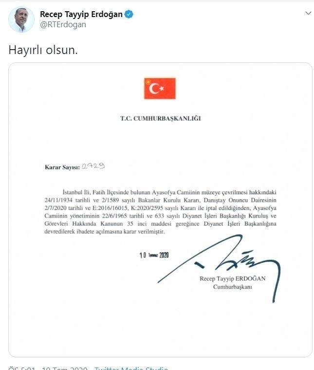Başkan Recep Tayyip Erdoğan, aynı gün Ayasofya'nın yeniden ibadete açılmasına ilişkin kararnameyi imzalayarak, sosyal medya hesabından "Hayırlı olsun" notu ile Türk halkına müjdeli haberi verdi.