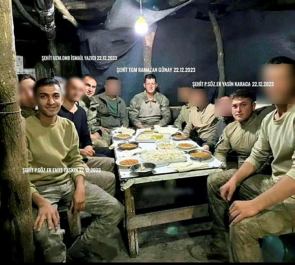 Irak'ın kuzeyindeki Pençe-Kilit bölgesinde 22 Aralık 2023 tarihinde terör örgütü PKK'nın saldırısında şehit olan 6 kahramanın 4'ünün yer aldığı fotoğraf yürekleri burktu. Yakın zamanda çekildiği anlaşılın fotoğrafta 4 kahraman şehidimizin aynı sofrada yemek yediği görülüyor.
