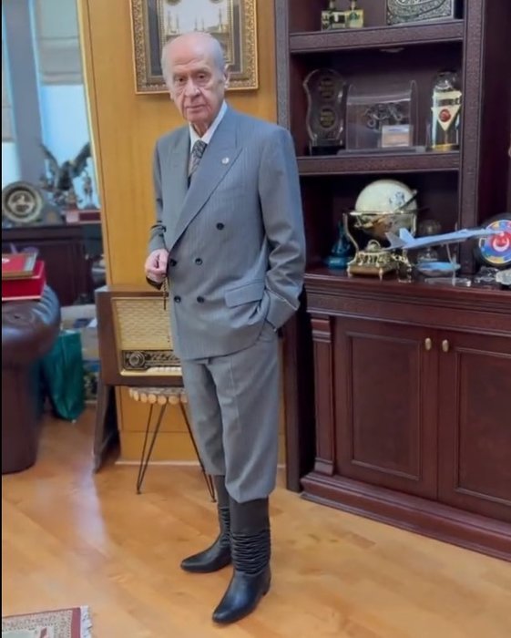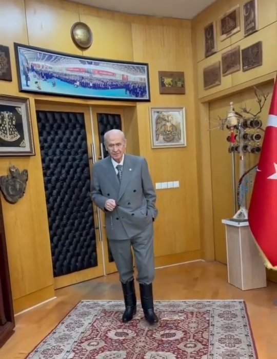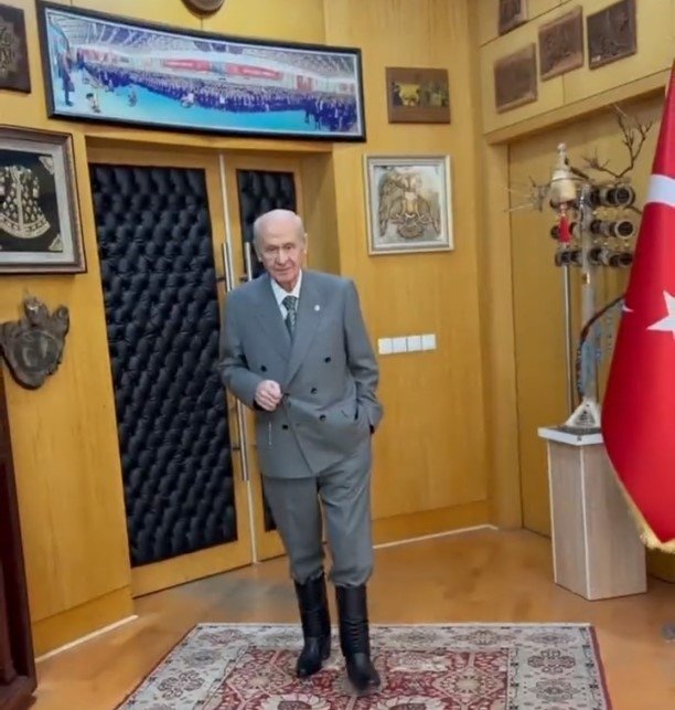 MHP Lideri Devlet Bahçeli, 1. Dünya Savaşı ve Milli Mücadele Döneminde Subayların giydiği körüklü çizmeleri giydi. MHP'nin paylaşımındaki videoda MHP Genel Başkanı Devlet Bahçeli, elinde tespihi, ayağında çizmeleriyle, Zeki Müren'in "Ağlama Sevdam" şarkısı eşliğinde yürürken görülüyor.
