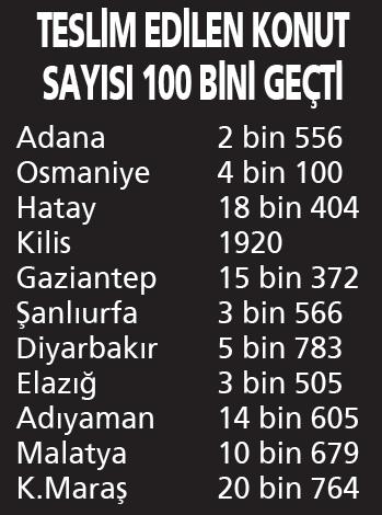 Bu ay Hatay'da inşallah Sayın Cumhurbaşkanımızın da katılımıyla bir anahtar teslim töreni yapacağız. Böylelikle teslim edilen yapı sayısını yaklaşık 15 bin daha artırarak toplamda 116 binin üzerine çıkarmış olacağız. Burada 11 ilimizin tamamını kapsayan bir anahtar teslim töreni yapacağız.